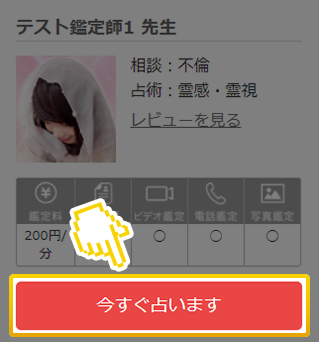 鑑定をしてもらいたい占い師の「いますぐ占います」ボタンを押し、鑑定申込画面にて「鑑定申し込み」ボタンを押してください。